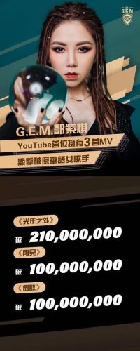 全创作天后邓紫棋(GEM)再度缔造超卓乐坛纪录,继去年《光年之外》及《再见》在Youtube成为破亿金曲后,她所演唱的《倒数》于6月3号在亦正式成功突破1亿观看次数大关,成为她个人第3首破亿金曲!