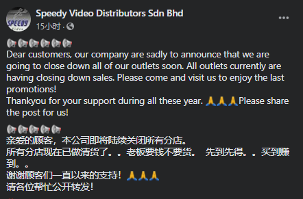 Speedy Video在面子书宣布:“亲爱的顾客,本公司即将陆续关闭所有分店。所有分店现在已做清货了。。老板要钱不要货。 先到先得。。买到赚到。。谢谢顾客们一直以来的支持!![]()