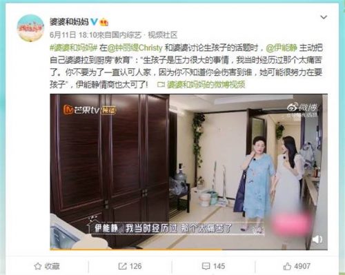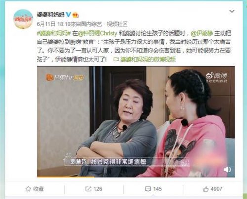 伊能静成功再当妈鼓励许多想怀孕的女性,她在真人秀《婆婆和妈妈》与钟丽缇聊到高龄生小孩,钟丽缇突然问婆婆:“如果我真的不会有孩子,你会怎么样”,张伦硕妈妈则直白说:“你没有孩子我会非常地遗憾,我会心里不痛快。”