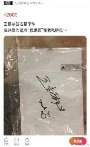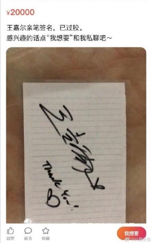 只是没想到,几天后这张签名就出现在中国二手交易平台上,卖家将签名以人民币20000元转卖,不仅如此,卖家连影印版都卖,一张要价人民币2000元,气得王嘉尔的粉丝大骂:“当人是傻的?”
