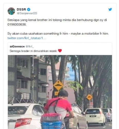 而且,这张照片也引起大马罪案监督特别小组(MyWatch)主席拿督山吉旺的关注,他在转發推文时也直接把电话号码贴出,希望找出这名外卖小哥,好送一辆摩哆给他。