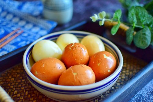 茶蛋:江西南昌地区,端午节要煮茶蛋和盐水蛋吃!蛋有鸡蛋、鹅蛋!蛋壳涂上红色,用五颜六色的网袋装着,挂在小孩子的脖子上,意味祝福孩子逢凶化吉,平安无事!