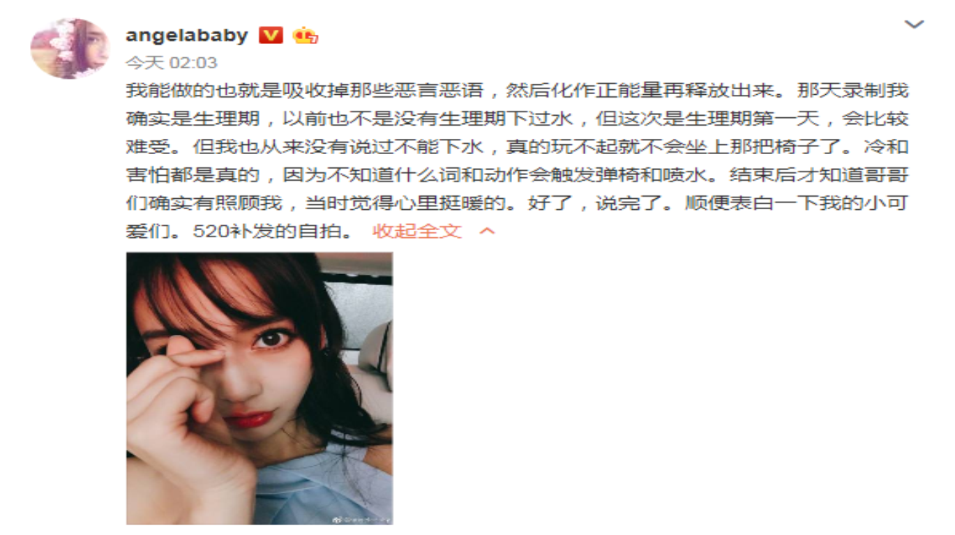 日前Angelababy上综艺节目,被安排下水玩游戏,她当场表示因生理期来了所以无法下水,消息传出后,遭轰“耍大牌”、“玩不起”。对此,Baby才在凌晨有感而发做出回应,她解释:“那天录影我确实是生理期,以前也不是没有生理期下过水,但这次是生理期第一天,会比较难受。 ”