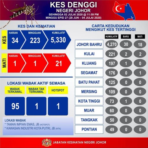 根据柔佛州卫生局發佈的数据显示,截至7月2日中午12时,州内一共發生了5330宗骨痛热症,其中每天平均33宗,一週有223宗病例。