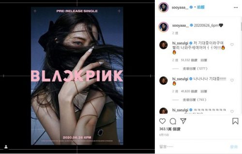 其实分属两大经纪公司的BLACKPINK与Red Velvet私交匪浅,日前BLACKPINK释出回归宣传照时,Red Velvet的瑟琪就曾在Jisoo的IG留言写,“我我我我!期待中”、“我好期待啊,快点出来吧!”让Jisoo不禁回她,“你是天使吧!谢谢你”。
