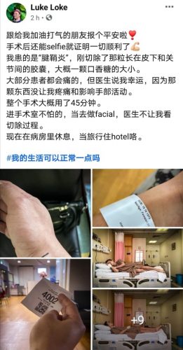 他笑谓住病房当作住酒店,手术当作做facial,更拍了几张“性感”照,惹笑网民,大家亦祝他早日康复。