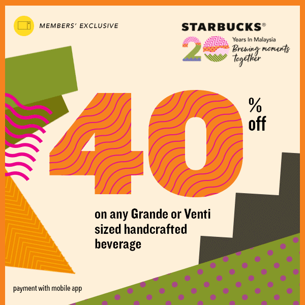 星巴克开斋节优惠高达40% 21 May , 2018 | 吃喝玩乐, 精选新闻 有好康!配合开斋节到来,星巴克提供会员独家优惠,今日及明日购买任何Grande或Venti Size的手工咖啡,即可享有40%优惠折扣! 这项优惠只限今日(2pm至5pm)及5月22日(7pm至10pm),全马分店推行,除了Sunway Lagoon Kiosk。 星巴克会员只要向员工展示相关帖文,并且通过手机应用程序进行付款即可。赶快jio朋友一起去购买吧! 分享