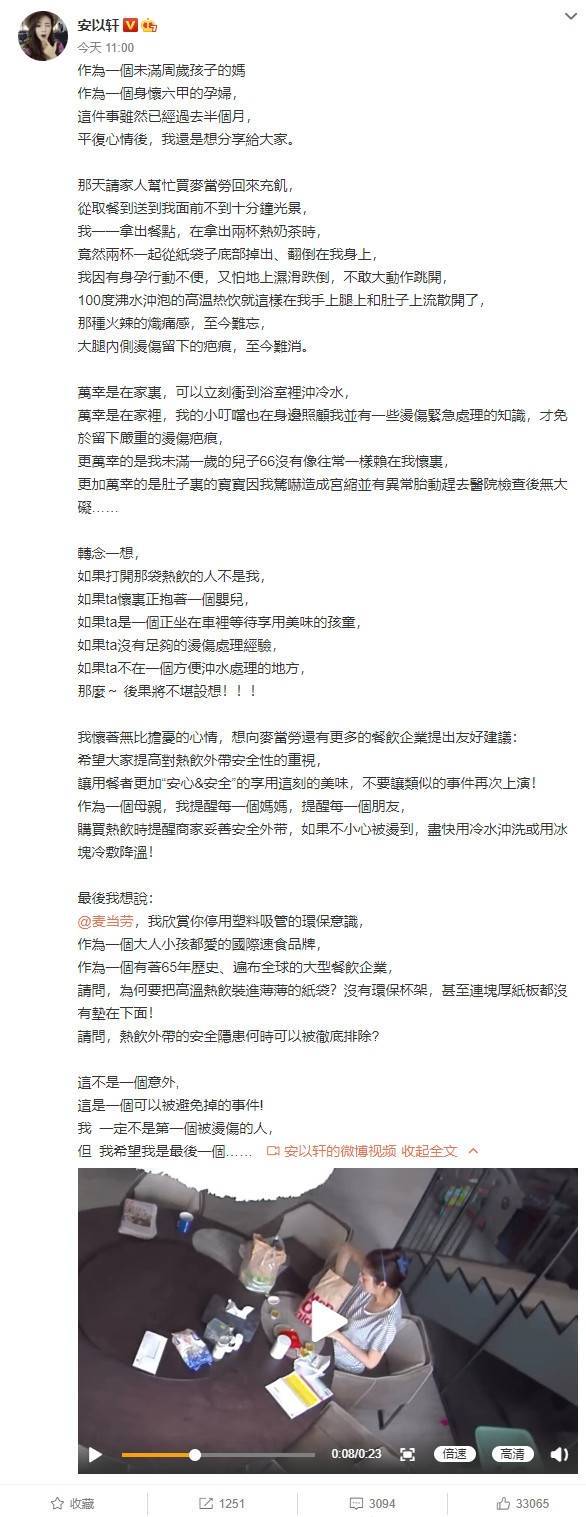昨天(8日)安以轩发文分享自己被麦当劳的外带热饮烫伤一事,并喊话麦当劳要提高对热饮外带安全性的重视,随后引起网友热议。