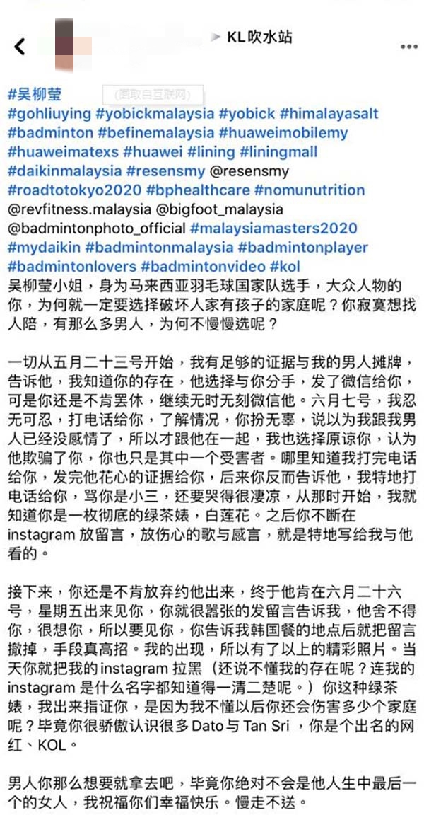 【特别报道】大马羽球混双女名将吴柳莹将被曝是小三破坏家庭,该名爆料者甚至指名道姓写“吴柳莹小姐,大马羽球国家队选手,大众人物的你,为何要选择破坏人家有孩子的家庭呢。”,对此当事人吴柳莹回应表示已经采取了法律行动。