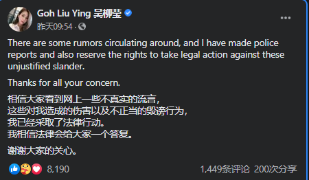 被指是小三的吴柳莹也在官方脸书发文透露已报案:“相信大家看到网上一些不真实的流言,这些对我造成的伤害以及不正当的毁谤行为,我已经采取了法律行动。我相信法律会给大家一个答复。谢谢大家的关心。”