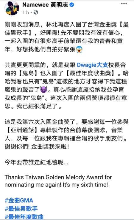 黄明志则以《亚洲通话》3度入围最佳国语男歌手,与周华健、吴青峰、张震岳、J.Sheon和裘德争歌王宝座。第31届金曲奖颁奖典礼原定6月底进行,因受到新冠肺炎影响,展延至10月3日在台北流行音乐中心举行。
