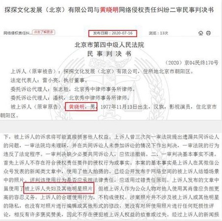 黄晓明不满社交平台“探探”擅用他和Angelababy的婚礼照片,推广自家产品,而向对方索偿15万人民币(约9万1480令吉),法庭判探探需赔黄晓明8万人民币(约4万8789令吉)、连续3天刊登道歉声明。在16日,二审民事判决书出炉,文件清楚显示黄晓明和Angelababy仍是夫妇。