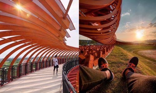 这里还有另一座天桥,那个感觉就有点像日本的千鸟居,同样颜色也是非常亮丽!如果穿白色衣服,站在桥内拍照肯定非常突出!此外,这里还有一座橙色的观景台及湖景等,不管是想要在这里运动、骑脚踏车,还是野餐也非常合适!周末和家人待在此处,悠闲地度过旁晚时分一定很棒!