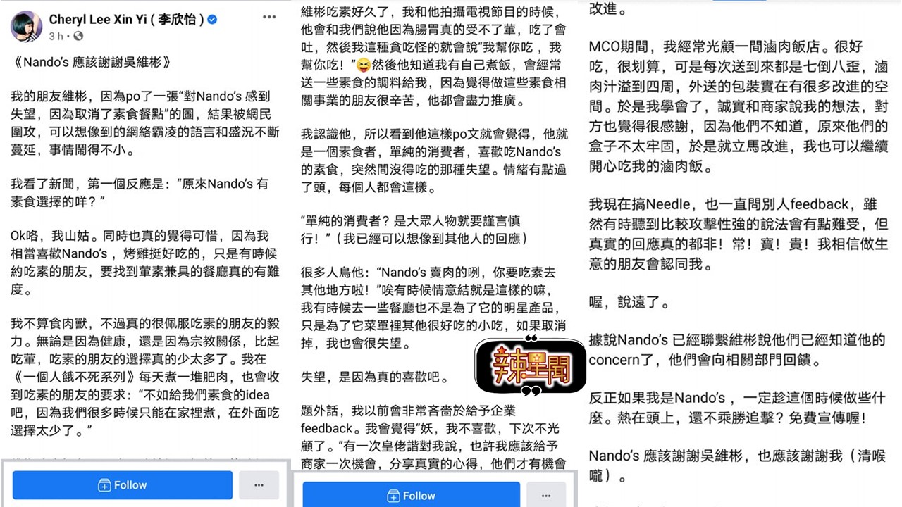 吴维彬是素食主义者,日前到Nando’s享用素食,怎料餐厅不再提供素食,他在餐厅门口,手比“unlike”手势拍照,激动以英文写道:“从此没有素食选项了!这是我其中一间很喜爱的,但刚刚发现他们移除了素食餐单!!对全世界都走向健康餐的选项餐饮来说,是一件多么愚蠢的事情…对@nandosmy感到非常失望,再也不光顾Nando’s了。”在标签中,他最后一句还特别强调写“别强逼我吃肉”。