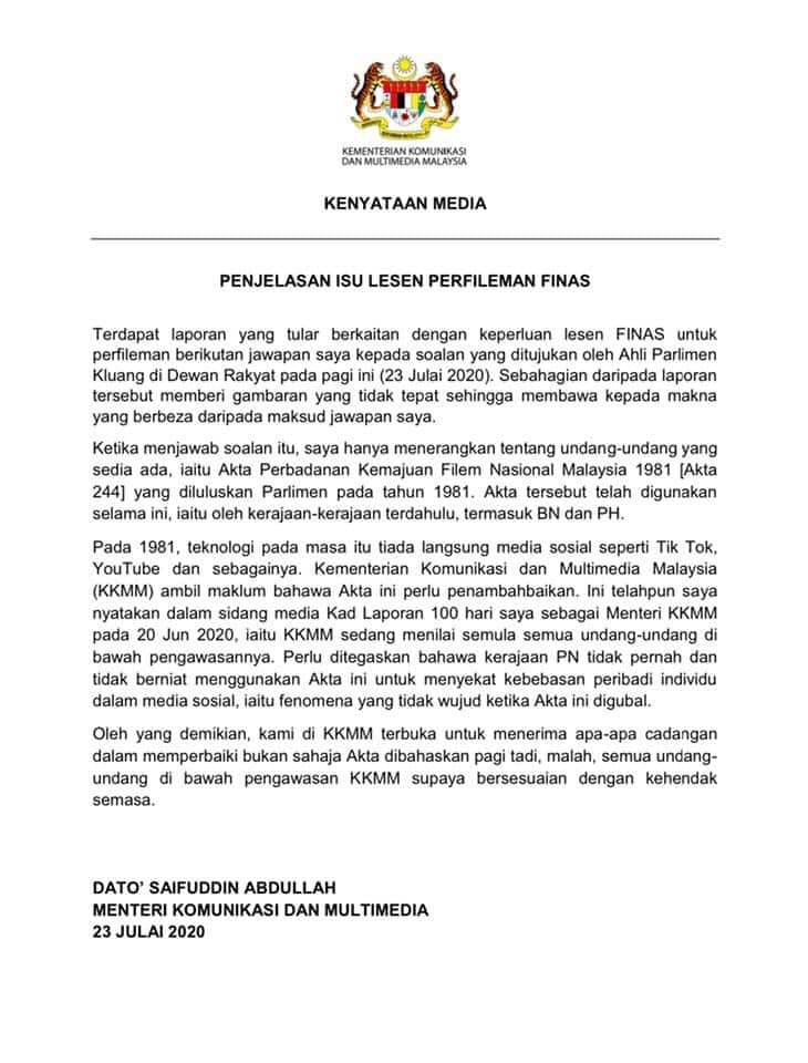 面对排山倒海抨击,通讯及多媒体部长赛夫丁阿都拉在傍晚发文告强调,会改善有关法令,确保所有法律符合时代需求。
