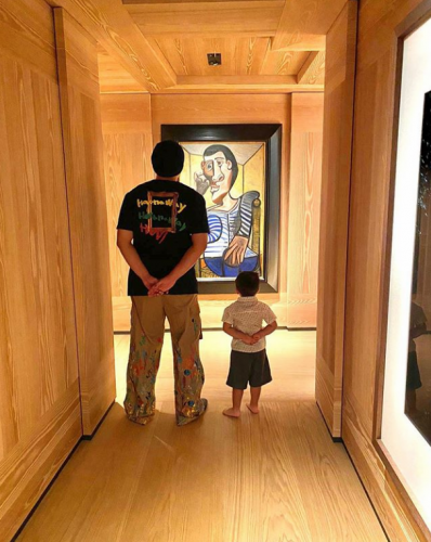 天王周杰伦在个人社交平台晒出一张与儿子罗密欧的合照,两人站在一起观看一幅画作。周杰伦身穿黑色T恤搭配卡其色个性长裤,双手背在身后酷劲十足。儿子罗密欧身穿白色衬衫搭配黑色短裤,潮流程度完全不输爸爸,赤脚站在周杰伦身边摆出同款背手姿势可爱满分。
