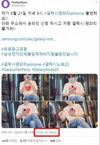 圭贤14日于推特宣传21日将会出席三星的活动,附上的4张用三星手机拍下的自拍,不料特推有发布来源的功能,意外发现圭贤竟然是使用苹果手机来上传三星活动文宣,让粉丝哭笑不得地马上标记提醒。