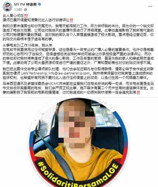 从事电台DJ工作18年来,我从未在电台节目里使用过任何粗言秽语,这也是身为一名专业的广播人必备的首要条件。也许你是抱着好玩的心态而PO了这帖文,但很遗憾地说这样的举动可能会让你承担极度严重的法律诉讼,而你的举动却对我林徳荣造成了很大的身心影响,工作及名誉的受损,甚至为我的家人和亲戚朋友造成不便。此事动用了公司大量资源彻夜进行严谨的查证之外,厂商和赞助商也对你的贴文深感不满。