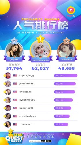 《Star Quest亚洲直播王》接下来参赛的艺人还有本地男子组合Fuying & Sam(8月28日)。成功进入120名参赛者将先获得500美元,参赛者将分为24组,主办单位也将根据参赛者的总人数来进行分配时段,每天会有2个时段:晚上8时30分至9时30分(时段1)/ 晚上9时30分至10时30分(时段2),每组有20名参赛者,评分包括80%观众总数及20%打赏总额。参赛者每一次晋级将会获得丰厚的奖金,而每次的晋级,也能累积越来越多的现金奖。