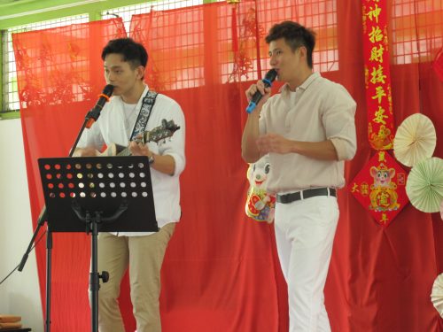 两人在台上献唱与长者们提早庆祝中秋节。