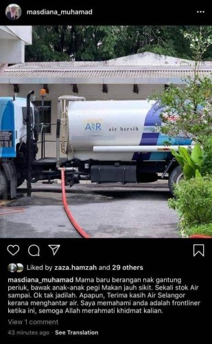 玛斯蒂安娜是于本月5日在个人Instagram帐号上传一张雪州水务管理公司(Air Selangor)水槽车停在家门前的照片,水槽车接了长长水喉似是把水输到住宅,玛斯蒂安娜在贴文中写道,她正打算带孩子到较远的地方用餐,水槽车刚好到来,感谢该公司前来派水。
