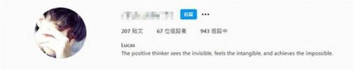 此外,Lucas还在自介部分写道:“The positive thinker sees the invisible, feels the intangible, and achieves the impossible”,意即积极的思考者,可见无形并感受无形,将不可能变成可能,满满正能量被赞想法很成熟,而目前Lucas发布了207则贴文,关注了943人、有43人追踪,但因设定成私人账号关系,让外界不能一窥他更多的生活点滴,而张柏芝发现泄漏儿子账号后,已经修正,目前没追踪Lucas了。