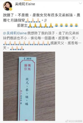 不过她日前忽然于微博,上载一张“附荐”纸照片,所谓“附荐”即是清明、盂兰节时,寺、观立纸位让亡灵附上去受供、听经的超度法事。该张“附荐”纸上写着:“故兄、弟、姐、妹,阳上吴卓林荐”,她留言说:“我想除了我的孩子,走了的兄弟姊妹们应该也不少,保佑每一个灵魂。感恩每一天。感谢天父、感恩每一天。”