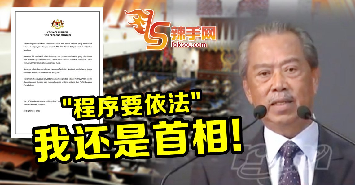慕尤丁:我还是合法首相! 23 Sep , 2020 | 民生关注 (布城23日讯)我还是合法的首相! 首相慕尤丁表示,政权更迭仍需依据宪法行事,所以他目前仍是马来西亚的首相。 他在今日发文告指出,尽管公正党主席安华声称已获得足够的支持议席,可以组成新政府,但一切仍只是其个人的说法。 “这一切都必须依法行事,否则安华的声明只是讲而已。” 他说,截至目前为止,国盟政府的政权依然稳定,而他仍然是合法的首相。 无论如何,他希望人民能够保持冷静,一切变故都会回归宪法作出定夺。 分享