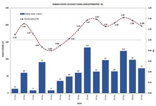 不过,沙巴的基本传染数已经恢复正常,在29日时仍处于1.26水平,这是因为每日都有较高的新增病例。