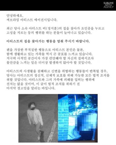 Rain的所属社通过官方SNS表示:“最近,到Rain和金泰熙家按门铃并大声喊叫的情况越来越多。”并公开了在Rain住宅前徘徊的怪汉的监控视频截图,并表示“假扮粉丝来进行这种不当行为,不仅是艺人本人,一起生活的家人也感到了极大的恐惧,本应是极其私人的空间,也是最舒服的自己的家,不应该发生这种令人不安的事件”,表明希望大家停止这种行为的立场。