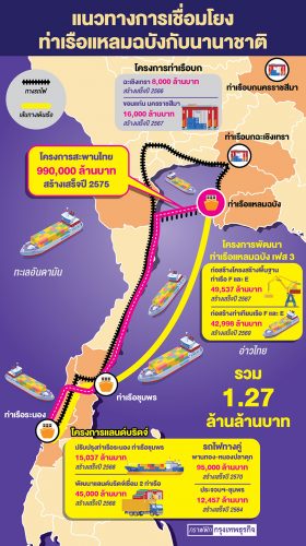 泰国交通部计划将位于安达曼海普吉岛上方的拉农深海码头,发展为集装箱码头运送南亚国家的货物;另外也发展另一边泰国湾的春蓬深水码头和货物运输系统,通过双线铁路和高速公路将2处深水码头连接起来。