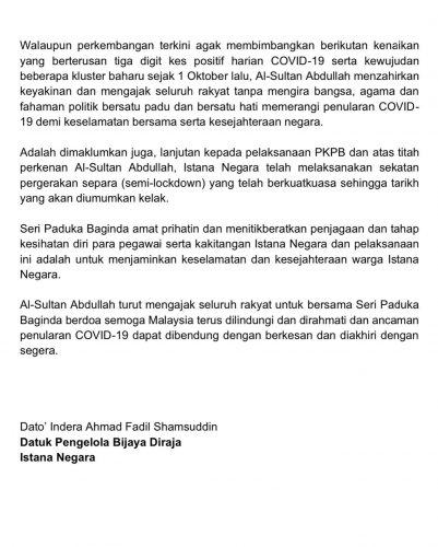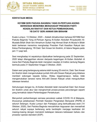 元首:安华没提支持名单 13 Oct , 2020 | 民生关注 (吉隆坡13日讯)国家元首强调,公正党主席安华并没有提呈任何足以证明他获得支持的名单! 安华今早觐见国家元首,并在稍后表示已向元首表明其手上“坚固及稳定的”国会议员支持者名单,人数多达120名。 不过,国家王宫立即发出声明,指安华并无提呈实质的名单,以证明他获得强大的支持。 王宫总管大臣阿末法迪尔在文告中指出,陛下今日在国家王宫与安华会面约20分钟。 文告指出,安华有声明其手上有足够的支持,惟并没有提呈完整的国会议员名单。 “陛下还促请安华尊重宪法上的各种必要程序。” 分享