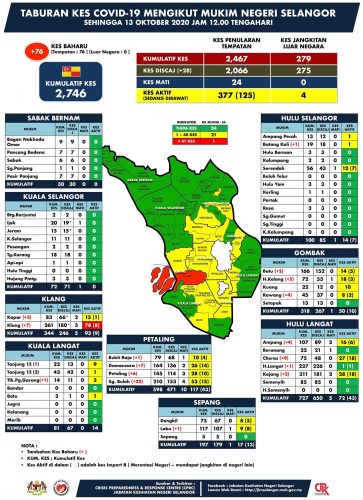 雪州今日确诊76宗! 13 Oct , 2020 | 民生关注, 民生百事 (吉隆坡13日讯)雪州今日确诊76宗,双溪毛糯大爆發! 根据雪州卫生局發佈的数据,雪州今日的确诊又再度飙高,达到76宗,其中最多还是八打灵县,达36宗,仅双溪毛糯就有22宗,情况令人担忧。 其次是乌鲁冷岳县16宗,蕉頼就佔了8宗,接着是鹅唛县11宗、巴生县10宗,其他县市都传出疫情。 雪州目前仍有377宗活跃病例,累积病例达2467宗。 分享