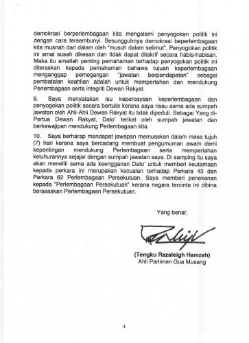 姑里倒慕 14 Oct , 2020 | 民生关注 巫统元老兼话望生国会议员东姑拉沙里还真参与“倒慕”行动,在安华9月23日宣布“变天”后隔两天(25日),即向国会提呈不信任首相动议。 姑里今晚公开他在两周前致给国会下议院议长,要求国会辩论及表决对首相慕尤丁的不信任动议信件。 姑里认为,该不信任动议应该有优先权,确保国会能确定慕尤丁政府的合法性。 姑里还公布议长阿兹哈在9月29日回函,议长表示,姑里的不信任动议是个人议员动议,国会必须先行完成所有政府事务,除非动议获得部长允准放行,否则该动议必须根据议会常规,即”排队“提呈国会辩论。 分享