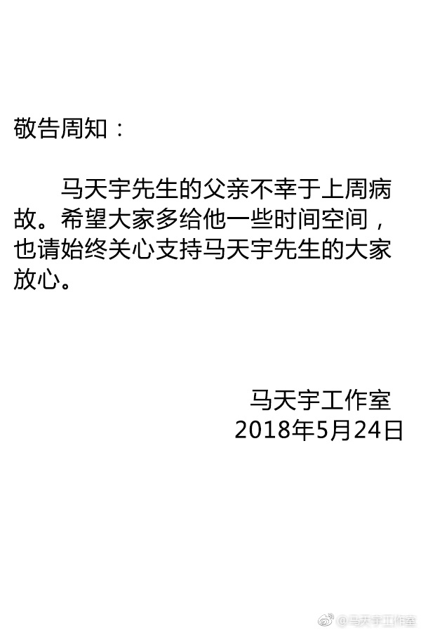 马天宇爸爸上周不幸病故 工作室呼吁给予空间 25 May , 2018 | 娱乐前线 马天宇工作室于24日晚发布讣告,透露马天宇父亲上周不幸病故,希望大家多给马天宇一些时间和空间,请大家放心。 稍早前,马天宇晒和爸爸拍摄的一组写真,父子俩亲密依偎、牵手,而配文称“跟父母缘尽至此,愿你我各自安好”,随后秒删引发猜测。新浪娱乐求证其工作人员,对方回应称:“他爸爸一周前突然去世了,之所以发这个微博是害怕粉丝担心,报个平安。” 粉丝纷纷表达哀思,以及对马天宇的支持,“我们一直都在他身后”“请安好,节哀”“叔叔一路走好,天宇要好好的”。 分享