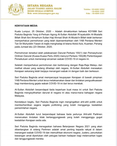 国家王宫大总管阿末法迪尔发文告表示,元首陛下今日与马来统治者讨论了首相慕尤丁要求实行紧急状态以对抗疫情的事宜。