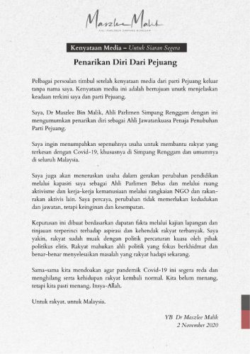 马智礼与敦马分道扬镳 2 Nov , 2020 | 民生关注 前教育部长、新邦令金国会议员马智礼宣布退出敦马的祖国斗士党! 马智礼在文告中指出,相信人民对政客精英(politikus elitis)的权力斗争感到厌倦,人民其实只需要专注服务和解决问题的政治人物。 他表示,将以独立议员身份继续推动教育改革,同时通过NGO、社运人士与朋友落实各项人道工作。 “现在该做的是全力帮助受疫情影响的人民,尤其是新邦令金的人民。” 分享