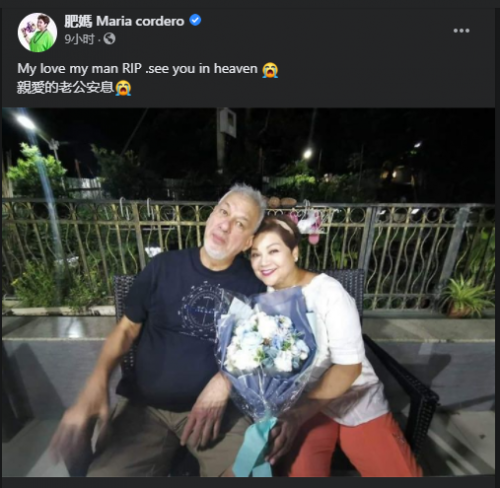 肥妈于近日凌晨在FB贴出与丈夫的甜蜜合照,并公布丈夫离世的消息,她留言话:”My love my man RIP .see you in heaven,亲爱的老公安息。”她接受访问时表示老公Rick昨日下午坐救护车入医院,直至半夜离世,她亦一直都陪在老公身边送他最后一程,面对于Rick的突然离世令她感到难以接受。