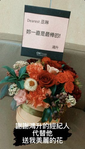 杨丞琳在IG限动分享黄鸿升送的花篮,原来这是对方经理人代替他送上,而且她也伤感说,9月底曾收到对方的语音讯息,说:“丞琳,我可以厚脸皮跟你要11月7号三个位子吗?因为我经纪人的女朋友很喜欢你”,而这也是黄鸿升过世前给她的最后语音讯息,在鸿升过世后,她不断反复听着,一度哽咽表示:“谢谢他的经纪人Dino带着代表鸿升666的公仔坐在他的位子。”