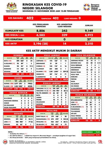 在402宗内,有346宗来自原有的感染群,19宗为密切接触者,20宗来自其他感染源头,17宗则来自鹅唛县的新感染群(Jalan Harapan),为扣留营内的集体感染。