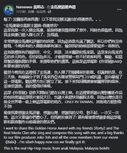 【特别报道】大马歌手黄明志执导电影《你是猪BABI》主题曲《Happy Family》入围第57届金马最佳原创电影歌曲,可惜最后败给同样来自大马的谢佳旺、许媛婷与新加坡音乐人陈文华共同创作由卢广仲演唱的《刻在你心底的名字》电影主题曲《刻在我心底的名字》,他事后在FB发文说:“接下来我回国将会被关押到拘留所接受调查”。