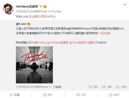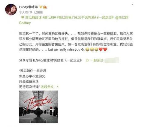 高以翔去世一周年 袁咏琳吴建豪等录制歌曲怀念 27 Nov , 2020 | 娱乐前线 高以翔在去年11月27日录制浙江卫视某户外竞技类节目时由于运动强度太大,突然倒地,在陈伟霆、黄景瑜等一同录制的明星艺人全力帮助下,送医后仍然救治无效,永远离开了大家。时间转瞬即逝,转眼间高以翔逝世就要满一周年,这一年网友们从未停止过对他的思念,在微博“高以翔去世一周年”的热门话题下,很多粉丝发文悼念。 高以翔的好友吴建豪、许晋豪、袁咏琳等人,昨日也为怀念高以翔逝世一周年,共同录制了一首新歌《一起走过》,表示希望用自己的方式,用高以翔最喜爱的音乐曲风,做一首歌表达大家对高以翔的想念和爱。 分享