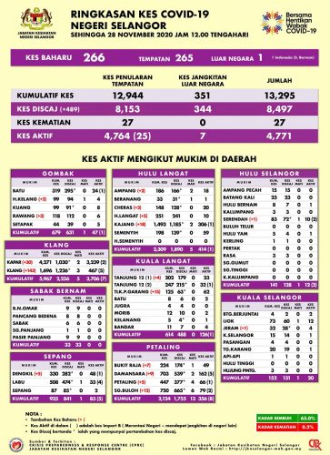 雪州今日新增266宗确诊 28 Nov , 2020 | 民生关注 (吉隆坡28日讯)雪州今日新增266宗确诊,加上吉隆坡的191宗,雪隆区确诊达457宗。 根据雪州卫生局数据,雪州今日截至中午12时,有489人痊癒出院,是值得让人高兴的事。 不过,266宗确诊依然位列全国第二高,其中,巴生县就有173宗确诊,大部份皆为职场感染及近距离接触的感染病例,手套厂莲花路感染群也是主要确诊病例来源。 州内其他县的确诊病例请参考下图: 分享