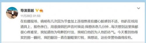 《戴假发的人》董越日前表示,黄晓明因为节食和连续熬夜拍戏,在拍摄期间好几次心脏不适,“他趴在戏用道具上,脸色惨白,用很微弱的声音对我说我想休息几分钟…每次想到这里我都很心疼难受”,董越表示知道黄晓明为了电影的付出、明白黄晓明的为人和志气。