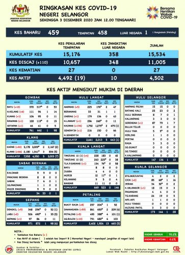 根据雪州卫生局数据显示,截至今日中午12时,州内确诊459宗,有1宗是境外输入病例。痊愈病例只有110宗。目前活跃病例仍有4502宗。