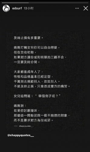 欧弟疑似回应罗志祥否认抢女友一事:及时止损有多重要 6 Dec , 2020 | 娱乐前线 罗志祥接受采访时,否认了当年抢欧弟女朋友一事,而欧弟在社交网站上转发语录疑似回应。 罗志祥否认抢欧弟女朋友一事,表示Makiyo是与欧弟分手后很长一段时间,才在一起的。晚间,欧弟在社交网站上转发语录疑似回应:“及时止损有多重要,妈妈叮嘱女儿你可以自由恋爱。但在交往期间,如果对方让你感到明显的三观不合,一定要及时分开。” 分享