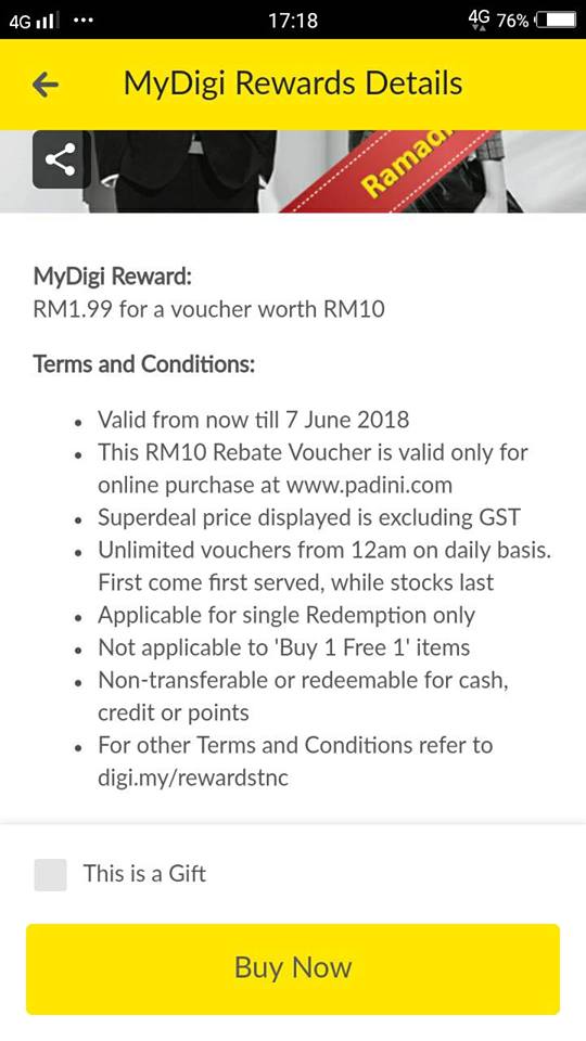 PADINI好康 现只需RM1.99即可购得RM10礼劵 27 May , 2018 | 吃喝玩乐 有好康!配合斋戒月的到来,服饰品牌PADINI与电讯公司Digi合作推出促销活动,Digi用户现只需RM1.99即可购得价值RM10的礼劵! 这项活动从即日起至6月7日,Digi用户只需打开My Digi应用程序,并进入Reward点击PADINI选项即可。当你点击Buy Now后,用户的账号将被扣除RM1.99,同时获得RM10礼劵。 不过,购买回来的礼劵只限于PADINI官网使用,并不适用于买一送一的物品。 分享