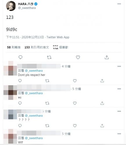 具荷拉离世1年 推特账号突然发文疑黑客所为 14 Dec , 2020 | 娱乐前线 已故韩国女星具荷拉离世1年,昨日她的官方推特突然更新,发文内容奇怪让人看不透,粉丝质疑账号遭到黑客入侵,愤怒表示“请尊重她”! 具荷拉生前在推特的最后发文是2019年11月20日,转发IG公演画面,以日文留言表达感谢,相隔1年无预警更新,文“123”、“9ld9c”令人一头雾水,不少粉丝认为这是黑客行为,纷纷留言“为什么这么不尊重她,这一点都不好笑”、“为什么要这么做,不要这样,别这样,眼泪都流下来了,拜托不要这样”,批评留言的声浪不断激增。 分享