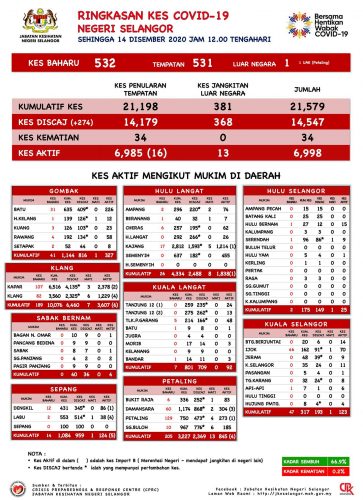根据雪州卫生局的数据,截至今日中午12时,531宗本土感染病例,1宗境外输入,累计病例达2万1579宗。今日只有274人痊癒出院,累计痊愈1万4547宗。州内活跃病例仍有6998宗。