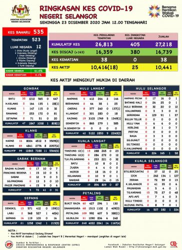 根据雪州卫生局数据,截至今日中午12时,雪州共發生535宗确诊,其中12宗为摬外输入。